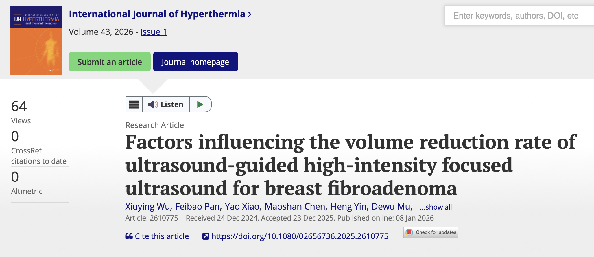 为探讨超声引导下高强度聚焦超声(HIFU)治疗乳腺纤维腺瘤(FA)后12个月体积缩减率(VRR)的影响因素。
