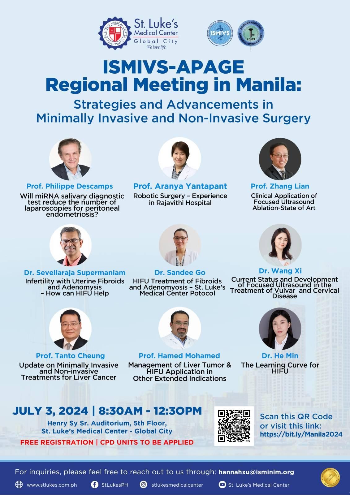The 2024 ISMIVS-APAGE Regional Meeting occurred on July 3rd, in Manila, Philippines, at the St. Luke’s Medical Center Global City. Themed Strategies and Advancements in Minimally Invasive and Noninvasive Surgery, the conference presented a comprehensive program on minimally invasive and noninvasive techniques such as high-intensity focused ultrasound (HIFU) and robotic surgery..